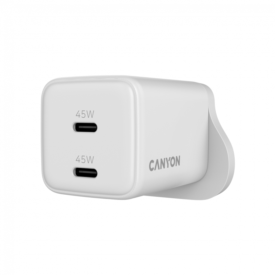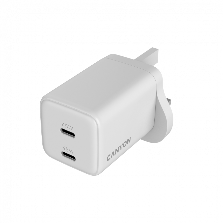 CANYON CU45CC-UK to kompaktowa ładowarka o mocy 45 W, która dzięki dwóm portom USB-C umożliwi Ci szybkie i jednoczesne ładowanie dwóch urządzeń. Niewielkie wymiary i zaawansowana technologia GaN sprawiają, że jest to idealny towarzysz w domu i w podróży.