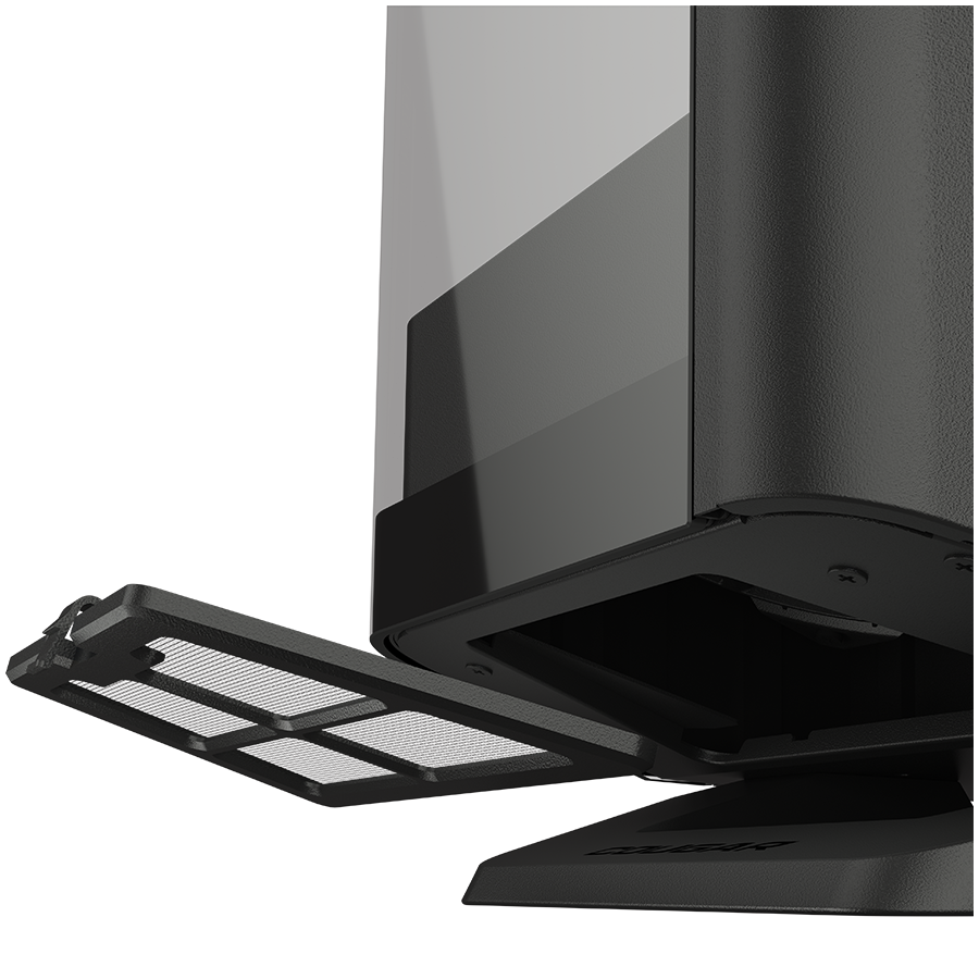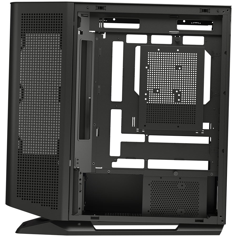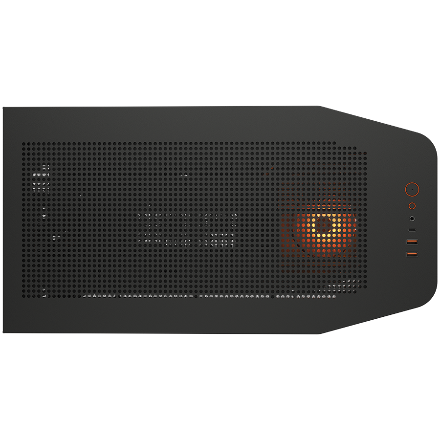 Innowacyjne rozmieszczenie wentylatorów na pochyłych powierzchniach umożliwia niezakłócony, skierowany przepływ powietrza. Podniesiony front otwiera dodatkowy kanał wentylacyjny od spodu, znacząco poprawiając chłodzenie. To nie tylko estetyka – to pełna funkcjonalność zamknięta w geometrycznej formie.