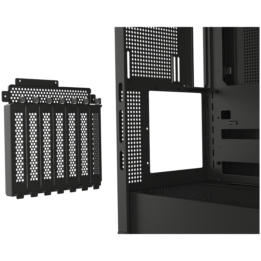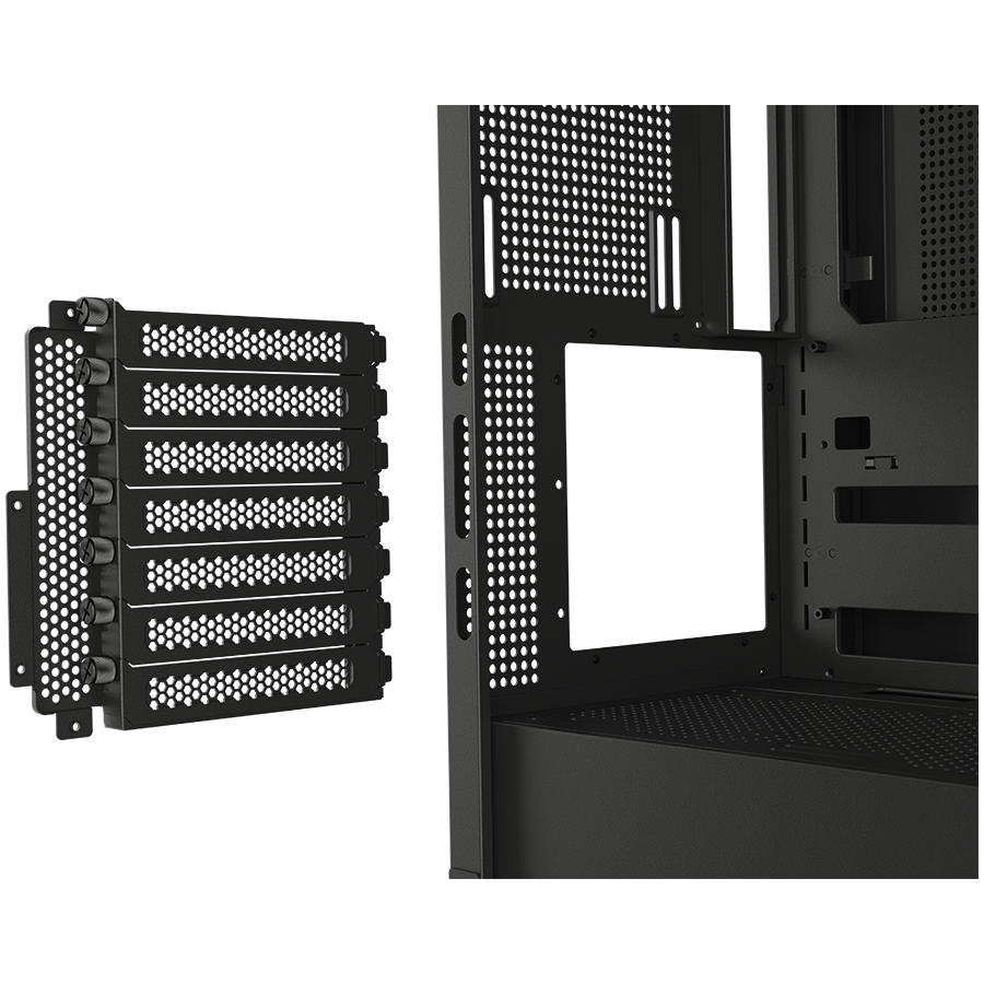 Obudowa bez problemu obsługuje nowoczesne płyty główne E-ATX, karty graficzne o długości do 420 mm oraz systemy chłodzenia wodnego. Dzięki obrotowym uchwytom GPU, możesz wybrać pionowy lub poziomy montaż karty graficznej. FV270 RGB jest kompatybilna z technologiami ASUS BTF, Gigabyte Project Stealth i MSI Project Zero.