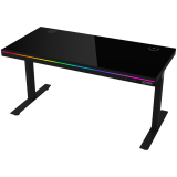 Dual-motor sit/stand adjustable-height gaming desk with wireless charger, RGB lighting, control panel, and USB ports, solid tempered glass tabletop, black.
