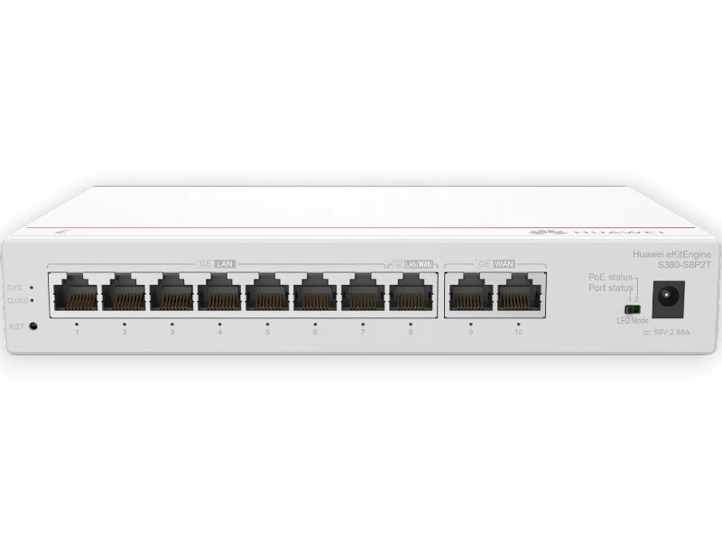 HUAWEI eKitEngine S380-S8P2T wyposażony jest w 8 portów LAN 1 Gb/s z obsługą PoE+, co pozwala jednocześnie zasilać i łączyć wiele urządzeń sieciowych z maksymalnym budżetem mocy 124 W. Dzięki temu można bezproblemowo uruchamiać punkty dostępowe Wi-Fi, kamery monitoringu, telefony VoIP czy terminale sprzedażowe, eliminując konieczność stosowania dodatkowych zasilaczy lub infrastruktur dedykowanych. Porty PoE+ automatycznie negocjują pobór mocy z podłączonymi urządzeniami, co zwiększa bezpieczeństwo i zapobiega przeciążeniu. Dwa porty WAN umożliwiają jednoczesne stosowanie dwóch niezależnych łączy internetowych, co zapewnia ciągłość działania nawet przy awarii jednego z nich. Możliwe jest również równoważenie obciążenia, co poprawia stabilność pracy użytkowników w środowiskach korzystających intensywnie z aplikacji chmurowych.