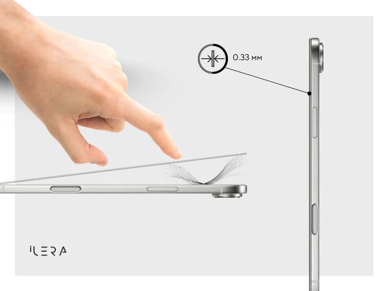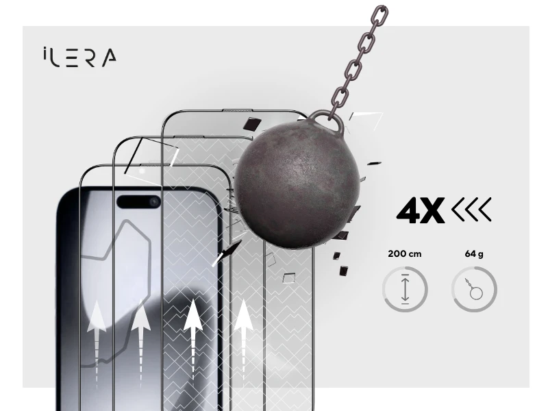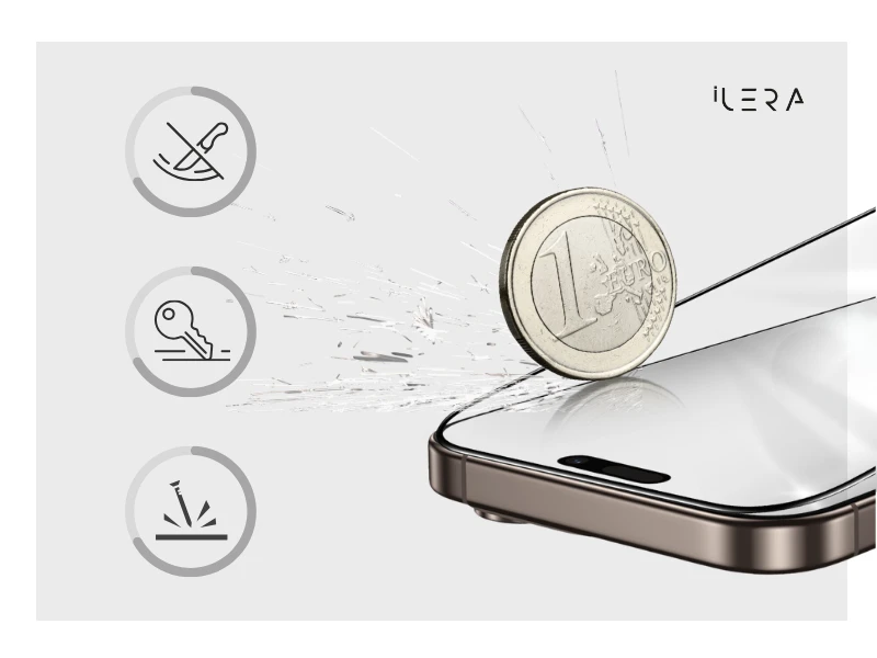 Sapphire Glass stworzone zostało nie tylko do testów laboratoryjnych, ale przede wszystkim do codziennego życia. Każdy element przechodzi potrójne hartowanie termiczne, nasz standard we wszystkich produktach iLera, a następnie wzmacniany jest zaawansowaną wymianą jonową. To unikalne połączenie przenosi odporność na uderzenia na zupełnie nowy poziom: szkło wytrzymuje upadek stalowej kulki o masie 64 g z wysokości 2 metrów. Od nagłego zsunięcia się z biurka, po codzienne wstrząsy podczas podróży - szkło pochłania siłę uderzeń, zachowując jednocześnie krystaliczną przejrzystość ekranu i perfekcyjną czułość dotyku. Mocne, a zarazem subtelne - oferuje ochronę bez dodatkowej masy.