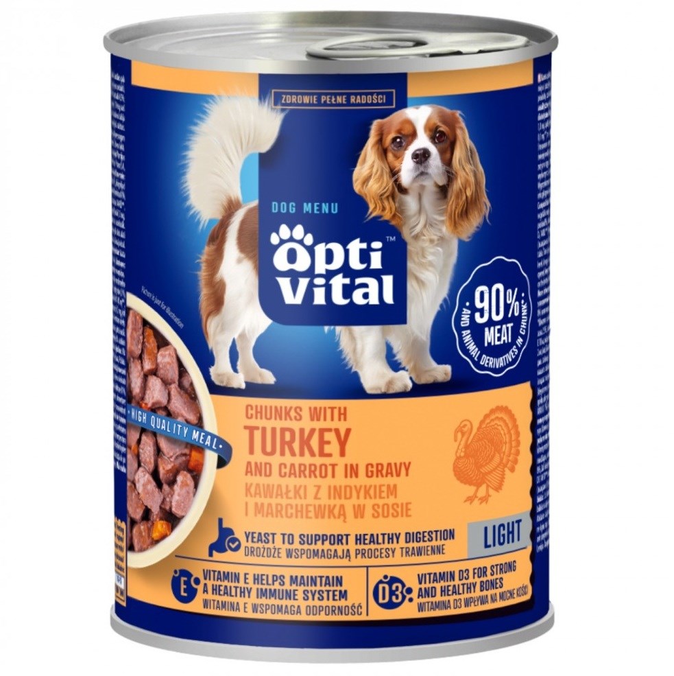 OptiVital puszka -soczyste kawałki dla dorosłych psów dietetyczne kawałki z indykiem w sosie 415g